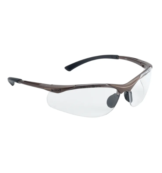 Tuotetiedot Suojalasit, jossa kevyt pronssinvärinen nailonkehys ja urheilulliset sangat.